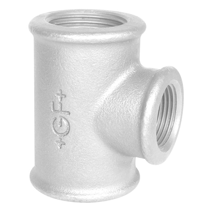 Soft cast fittings 00 0001 - 000 341 meet the requirements of ISO 49-DS/EN 10242. Available in black and hot-dip galvanized version. Hot dip galvanizing is carried out with min. 500 g/m2 of zinc Zn 99.9 according to DS/EN 10242. Pipe thread made according to DS/ISO 7-1 DS/EN 10266-1. External threads are conical (Increase 1:16), internal threads cylindrical.