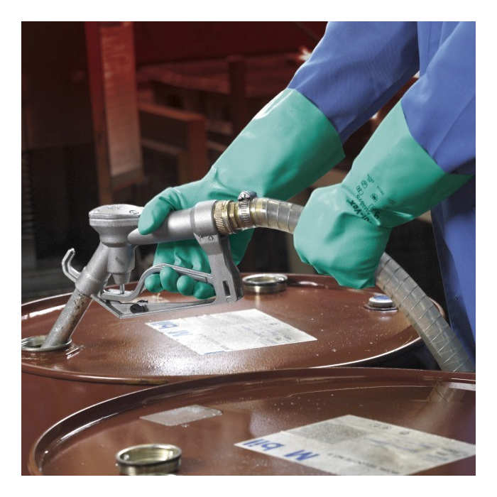 SOL-VEX® glove green. Material: Nitrile, smooth surface, lining of cotton velourization. Application: Straight edge. Length about 33 cm. Thickness: 0.38 mm. Sand-prøget grip. Antistatic according to EN 1149. Approved for handling food. Production and handling of chemicals, metallurgy, agriculture and printing. AQL 0.65. Approved for handling food. Category: III. Standards: Tested according to EN 420, EN 388, EN 374
