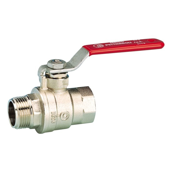 Compact ball valve with full flow. Red steel handle.