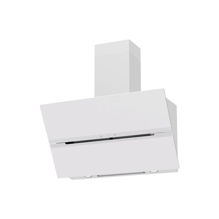 Emhættens skråtstillede front i mat hvidt glas samt krop og skorsten i hvidlakeret stål giver et eksklusivt og stilrent udtryk. Den 90 cm brede emhætte har en automatisk glasplade, der åbner trinvis i takt med hastighedsjustering - lukket på trin 1 og gradvist åbnet ved højere trin.