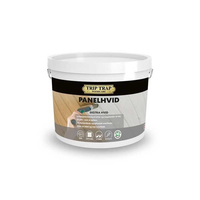 Trip Trap Panelhvid er et vandbaseret indeklimacertificeret produkt, der anvendes til lysning af gulnet træværk, træprofilbrædder, til lofter og vægpaneler. Panelhvid forebygger gulning af nyt træværk og reducerer muligheden for knastgennemslag